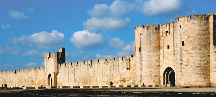 Ursprungligen staden byggdes på kusten, men Rhône floddelta har förändrats under åren och nu är staden i inlandet, men inte långt från Medelhavet. Namnet Aigues-Morte betyder "döda vatten" och hänvisar till det faktum att det var omgiven av de delvis stagnerande salt kärr. Andra städer som spolas med färskvatten, som kallas "Aigues-Vives" (levande vatten). Staden grundades av romarna omkring 100 f Kr. och senare runt 1240 var den franska Louis IX intresserade av att utveckla staden i en port vid Medelhavet. Staden byggdes ut och renoverades och befästes med flera torn och utförselhamn för korsfararna från 1248. Senare staden omges stadsmuren och vallgravar. Det finns nu en mer modern stad utanför murarna och gamla stan är mycket välbevarat och spännande att uppleva. Idag är staden en stor turistattraktion.