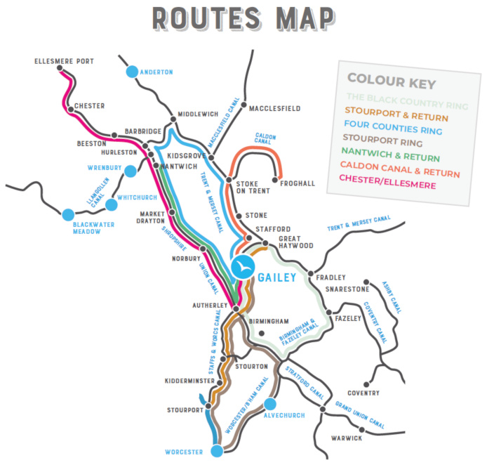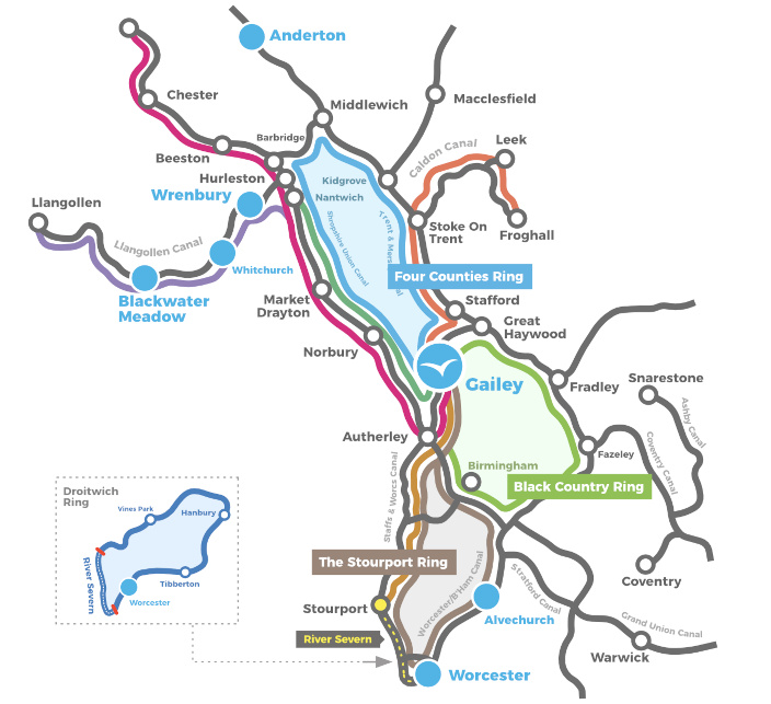 - Gailey är idealiskt placerad för denna ring som tar dig med på Staffordshire & Worcestershire Canal, genom Birminghams vattenfronter via den nya huvudkanalen, in på Birmingham & Fazeley och Trent & Mersey.