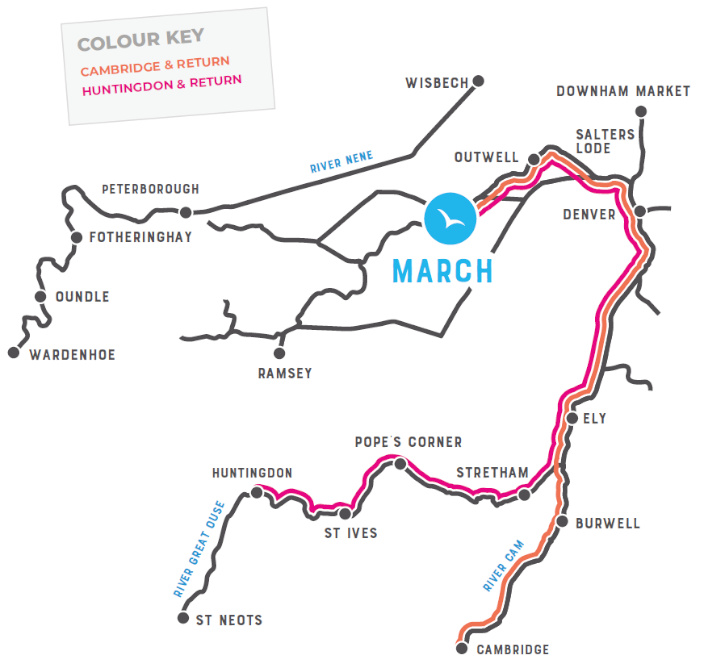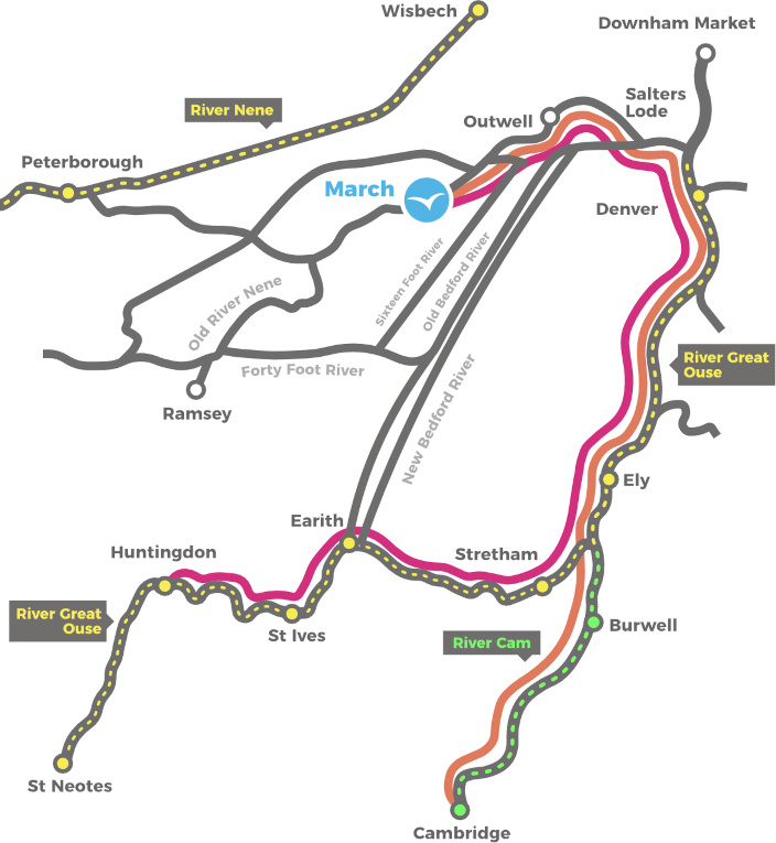 Denna väg tar vattenresenären på en resa som sprudlar av historia och djurliv - från staden som en gång var en ö, genom lugnt vatten och en bred himmel, äventyr genom den mäktiga Denver Tidal Sluice och nå Cromwells hemterritorium i Ely.