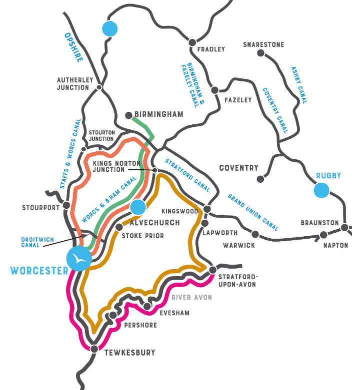 I området omkring Birmingham finns det gott om möjligheter att hitta en rutt som passar dig. Här finns tre baser att utgå från. Från Gailey Wharf får du ett varierat seglingsområde med en fin mix mellan landsbygden England och stadskulturen. Längs sträckan finns det gott om möjligheter att hitta familjevänliga aktiviteter. Eller vad sägs om att starta i Alvechurch Marina, som ligger i hjärtat av ett mycket varierat kanalnätverk i Midlands. Du kan också köra ut från Worcester, där floden Severn flyter igenom.