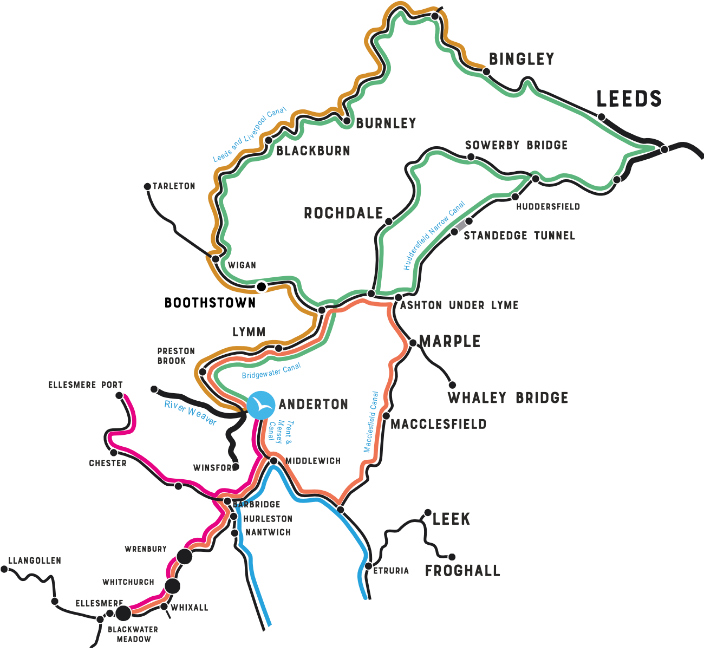 - Den sällsynta roterande bron, Barton Swing Aqueduct, som lyfter en liten kanal över en större