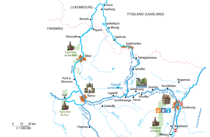 Canal de la Marne au Rhin, Canal du Rhône au Rhin (norra delen), Canal de la Sarre, dele af Mosel-floden och Canal de Vosges.