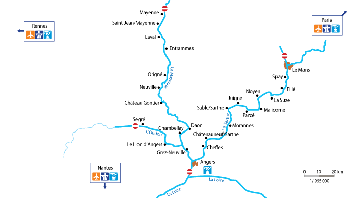 Från basen i Grez-Neuville är floden fint kantad av små landsbyar, herrgårdar och gamla kvarnar som närmast vilar på flodens sluttningar. Gå av i konststaden Angers, Kung Renés stad eller vid klosterkyrkan i Entrammes där den berömda Port Salut-osten också framställs. Konstmuseet i byn Laval är också värd ett besök.