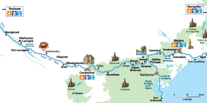 Canal du Midi, Canal de la Robine, Etang de Thau, Canal du Rhone á Sete Lez, Petit Rhone og Canal d'Arles á Bouc.