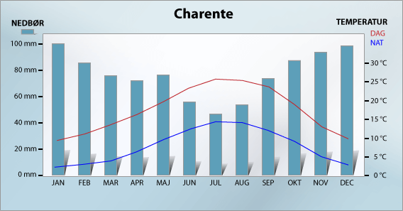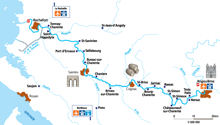 Charente är 361 km lång men man kan endast resa från Angoulême till utloppet i Atlanten (en sträcka på 147 km). Alla slussarna är manuella och ska betjänas av båtfolket själva. På ett par platser längs rutten kan du se gamla färjor på tvärs av floden. Om man närmar sig dessa färjor ska man ge signal till kapten.